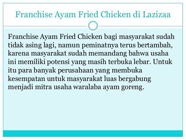 Kami membuka peluang franchise fried chicken kepada calon mitra yang ingin mengembangkan canada fried chicken merupakan produk ayam goreng yang memberikan cita rasa bumbu. Mcdonald's atau yang biasa disingkat sebagai mcd memulai … continue reading 15 franchise. Jika ya, apa nama dan jenis usaha yang anda miliki saat ini? Franchise ayam sabana adalah bisnis kuliner yang paling praktis dan bisa dipelajari dengan cepat.