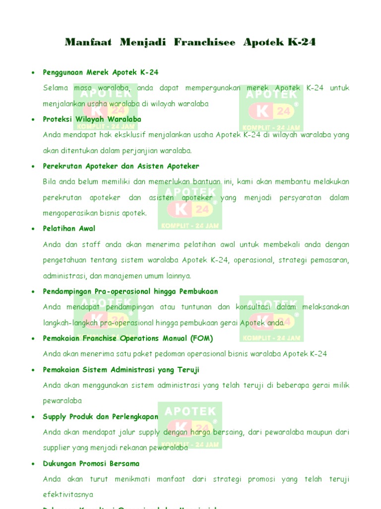 13+ Bisnis Waralaba Apotek Strategi. Franchise apotek yang sudah terbukti mempunyai sistem yg unggul, brand kuat, royalty fee ringan, & dukungan yang terpadu. K24 indonesia membuka gerai pertamanya di jalan magelang, yogyakarta.