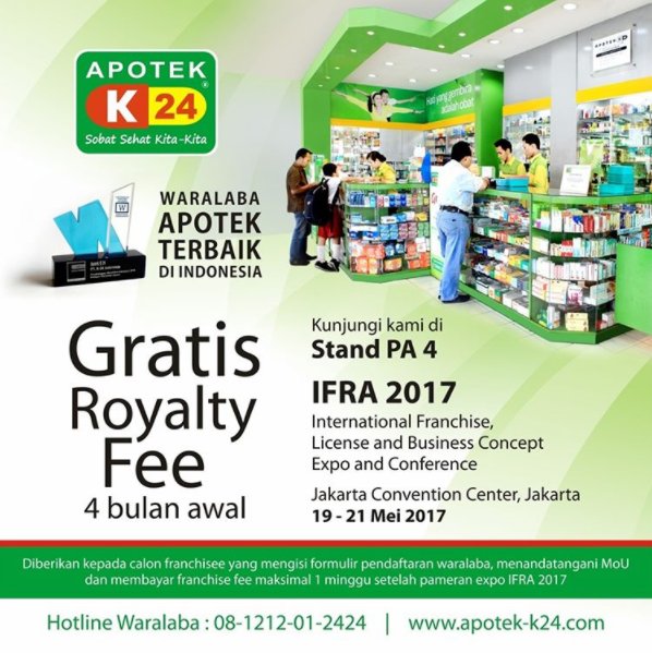 Franchise apotek yang sudah terbukti mempunyai sistem yg unggul, brand kuat, royalty fee ringan, & dukungan yang terpadu. Kedekatan outlet akan menghemat waktu yang sangat di perlukan untuk mengurangi penderitaan pasien. Dedikasi untuk melayani masyarakat dengan manajemen yang modern dan kebijakan harga. Seperti waralaba apotek malaka yang sudah berdiri sejak 2006 lalu.
