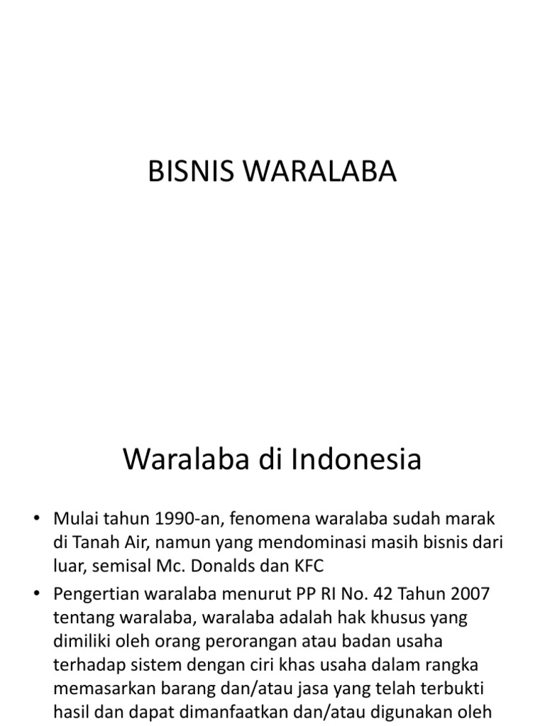 Sering mendengar istilah waralaba atau franchise ? Pertama adalah bisnis waralaba yang berasal dari luar negeri yang membuka bisnisnya di indoensia. Kerja sama dalam bidang usaha dengan bagi hasil sesuai dengan kesepakatan;. Berikut ini adalah arti, makna, pengertian, definisi dari kata waralaba menurut kamus besar bahasa indonesia (kbbi) online dan menurut para ahli bahasa.