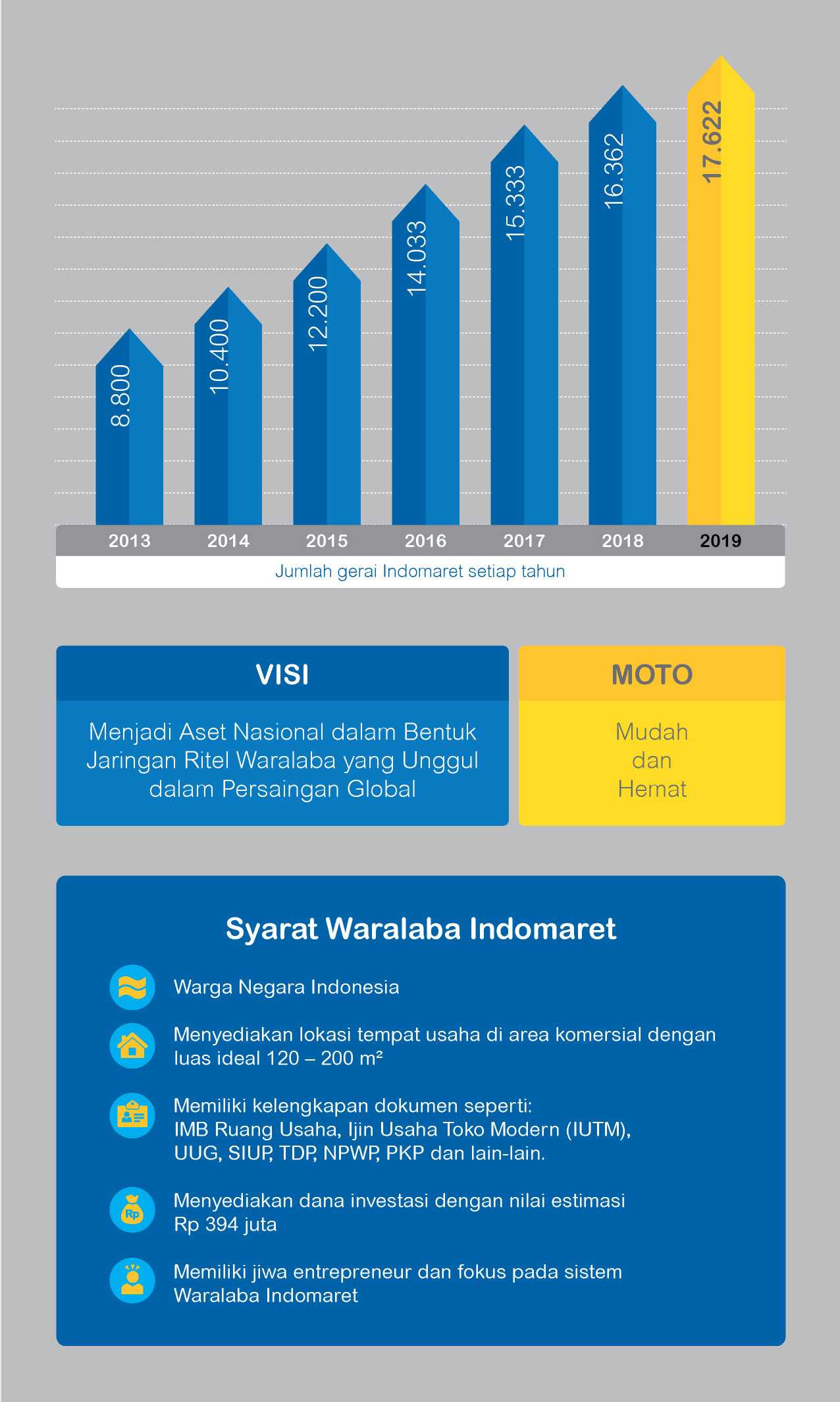 Dengan jumlah gerai alfamart sebanyak lebih dari 12.000 gerai dan tersebar di beberapa wilayah di indonesia, pastinya anda tidak akan kesulitan untuk menemukan ritel waralaba yang satu ini. .kerjasama waralaba, dengan jumlah minimarket milik sendiri 2.396 (2009) dari semula 2.067 selain itu, prestasi alfamart juga dapat dilihat dari jumlah gerai alfamart yang terus berkembang. Alfamart sebagi peritel waralaba yang saat ini di bawah naungan pt.