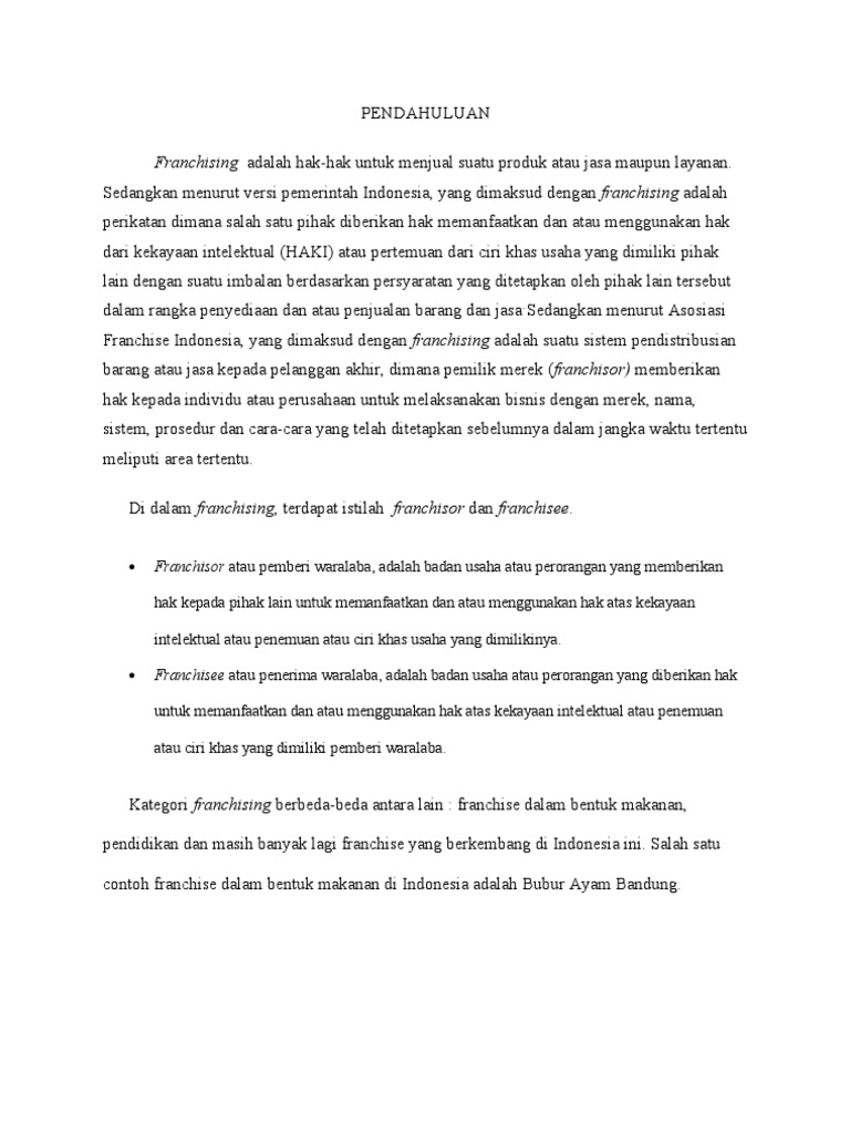 Pengertian franchise fee adalah biaya awal waralaba yang harus dibayarkan oleh franchisee kepada franchisor sebelum. Contoh nyata dari franchise adalah mc donalds, kfc dan pizza hut yang berasal dari usa, bread talk yang berasal dari singapura, dan masih banyak lagi bisnis franchise lainnya. Contoh proposal usaha franchise yang baik adalah contoh yang mampu menjelaskan isi dan tujuan dari proposal itu sendiri dan disusun secara sistematis dengan penggunaan kata yang tepat dan tidak.