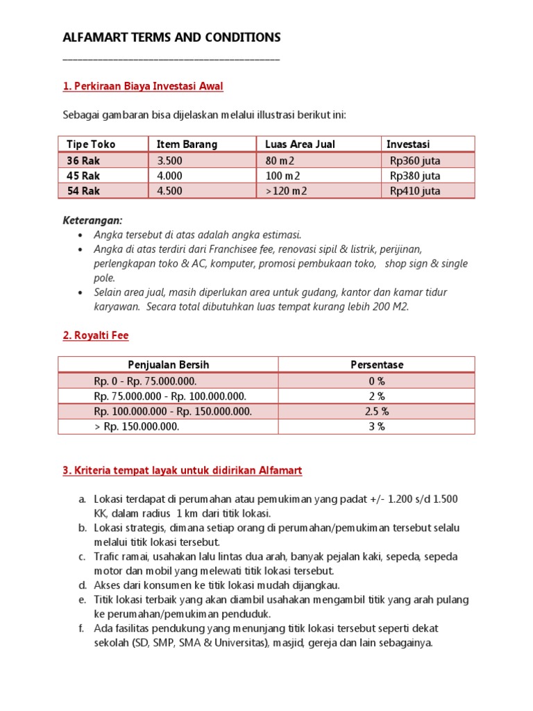 Mohon ijin bikin trit gan. Karena dari pihak alfamart sendiri juga butuh mitra (baca pewaralaba) pertimbangan bisnis untuk alfamart sendiri mungkin mereka sudah tidak keluar modal namun mereka diberikan lokasi pemasaran baru untuk jualan barang. Kunci bisnis waralaba alfamart ini adalah memiliki modal (uang) yang besar. Untuk modal yang dibutuhkan dalam cara bergabung dengan alfamart sendiri dibutuhkan sekitaran 300 hingga 400 juta rupiah untuk modal awal bergabung.