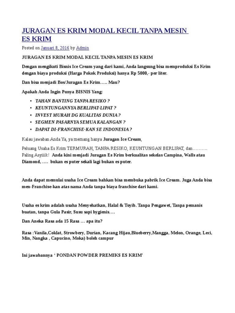 Kalau dulu peluang usaha es krim hanya dimiliki oleh mereka yang bermodal kuat, maka tidak untuk saat ini. Es krim diamond neopolitan chocochip : Menerima pesanan area tomohon, tondano,kawangkoan, tanawangko dan daerah sekitarnya.