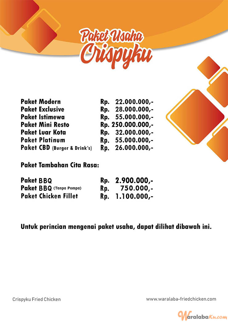 Alfamart, kentucky fried chicken, starbucks adalah contoh dari sistem usaha/bisnis waralaba atau dalam bahasa inggris disebut dengan franchise dimana franchise itu sendiri berasal dari bahasa latin yakni francorum rex yang artinya bebas dari ikatan, yang mengacu pada kebebasan untuk memiliki. Sahabat mitra crispyku lovers di seluruh indonesia ❤❤. Berikut ini rangkuman galeri produk dan fasilitas van java waralaba fried chicken, solusi franchise fried chicken harga murah tapi dengan rasa ayam goreng crispy yang berkelas. Usaha fried chicken, jamur crispy dan waroeng steak tergolong bisnis yang banyak diminati.